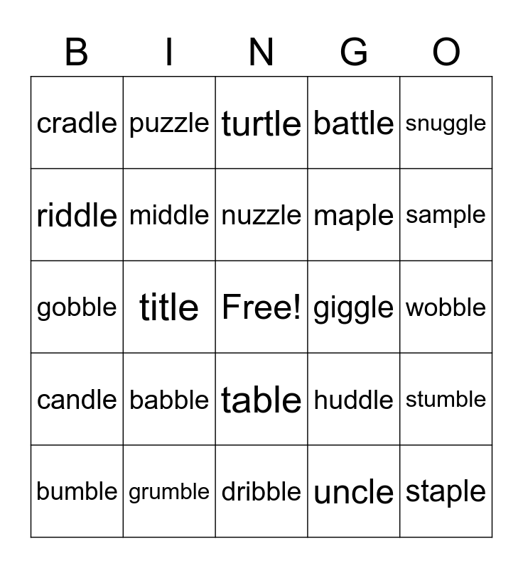This bingo card has a free space and 24 words: babble, grumble, nuzzle, bumble, snuggle, cradle, riddle, puzzle, giggle, table, maple, gobble, huddle, stumble, middle, uncle, wobble, turtle, sample, title, staple, candle, battle and dribble.