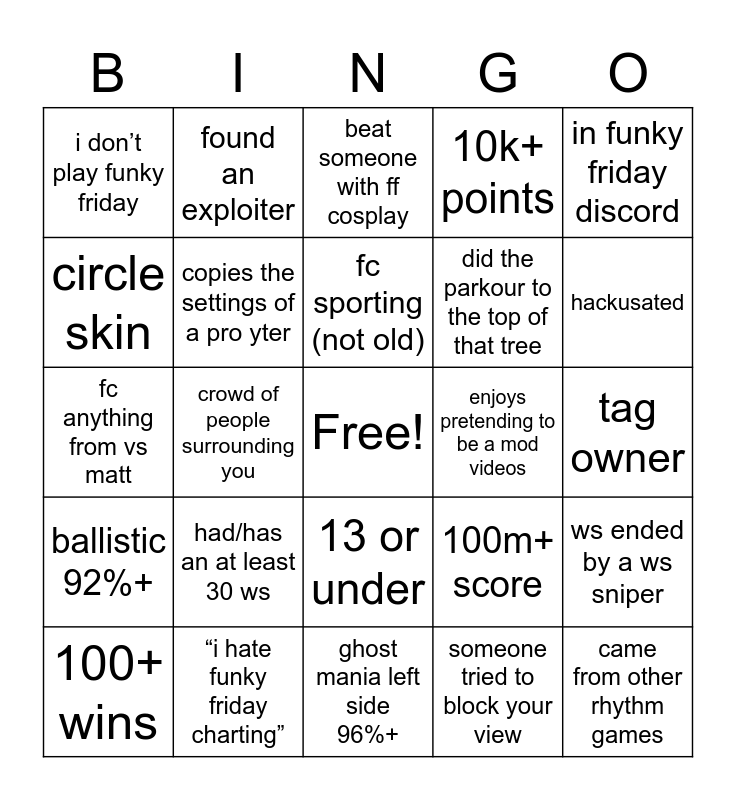 This bingo card has a free space and 24 words: 100+ wins, had/has an at least 30 ws, fc sporting (not old), someone tried to block your view, in funky friday discord, i don’t play funky friday, found an exploiter, beat someone with ff cosplay, enjoys pretending to be a mod videos, tag owner, fc anything from vs matt, copies the settings of a pro yter, 100m+ score, ws ended by a ws sniper, circle skin, “i hate funky friday charting”, ghost mania left side 96%+, 10k+ points, hackusated, ballistic 92%+, crowd of people surrounding you, 13 or under, did the parkour to the top of that tree and came from other rhythm games.