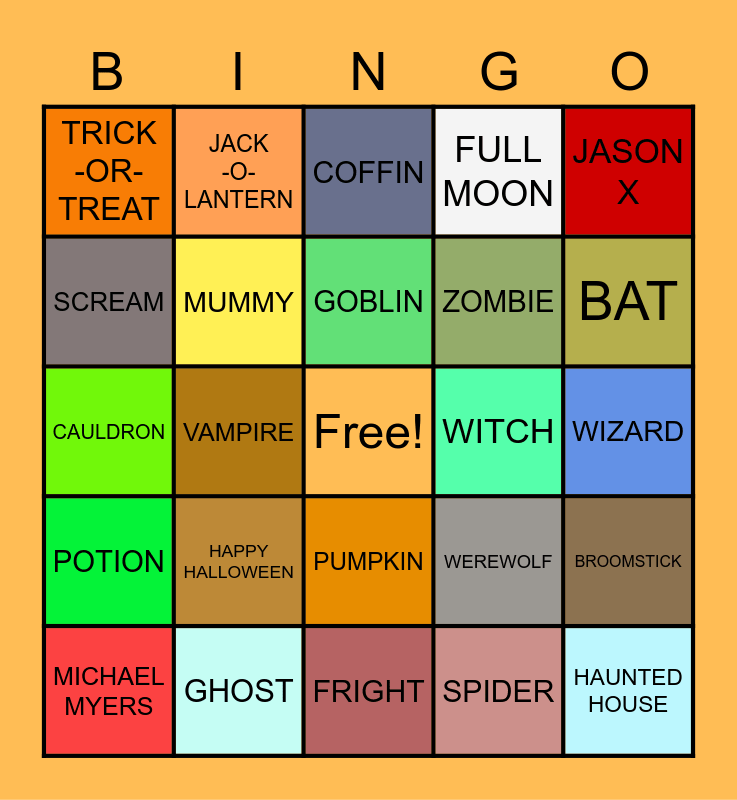 This bingo card has a free space and 24 words: HAPPY HALLOWEEN, GHOST, GOBLIN, MICHAEL MYERS, JASON X, TRICK -OR-TREAT, SCREAM, JACK -O-LANTERN, WITCH, PUMPKIN, ZOMBIE, CAULDRON, WEREWOLF, BROOMSTICK, MUMMY, SPIDER, WIZARD, COFFIN, BAT, VAMPIRE, HAUNTED HOUSE, POTION, FULL MOON and FRIGHT.