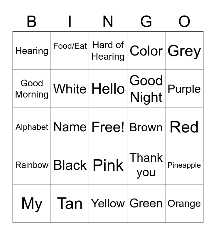 This bingo card has a free space and 29 words: My, Your, Name, Deaf, Hearing, Hard of Hearing, White, Black, Brown, Tan, Red, Orange, Yellow, Green, Purple, Blue, Pink, Rainbow, Grey, Alphabet, Thank you, How are you?, Good Night, Good Morning, Color, Food/Eat, Pineapple, Hello and Goodbye.