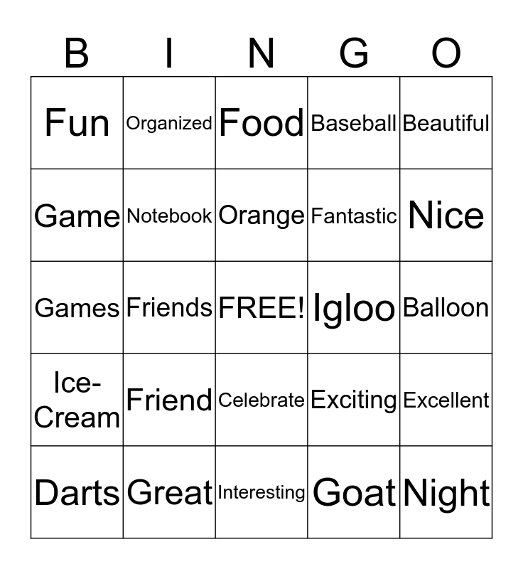 This bingo card has a free space and 24 words: Friend, Great, Orange, Darts, Beautiful, Fun, Game, Organized, Igloo, Celebrate, Fantastic, Games, Exciting, Excellent, Notebook, Goat, Balloon, Food, Nice, Friends, Night, Ice-Cream, Baseball and Interesting.
