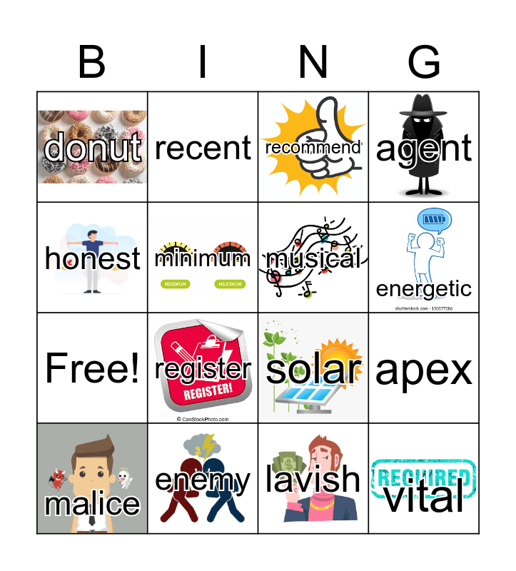 This bingo card has 15 images and 20 words: apex, vacation, recommend, topical, malice, honest, enemy, donut, Free!, recent, register, solar, minimum, vital, musical, element, energetic, agent, lavish and slogan.