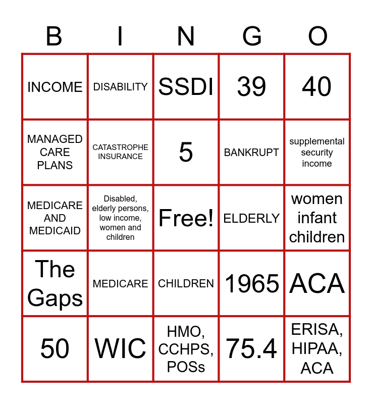 This bingo card has a free space and 24 words: MEDICARE, WIC, 5, 50, 40, INCOME, MANAGED CARE PLANS, DISABILITY, ELDERLY, CHILDREN, BANKRUPT, MEDICARE AND MEDICAID, 1965, ACA, CATASTROPHE INSURANCE, 75.4, women infant children, SSDI, supplemental security income, Disabled, elderly persons, low income, women and children, ERISA, HIPAA, ACA, The Gaps, 39 and HMO, CCHPS, POSs.