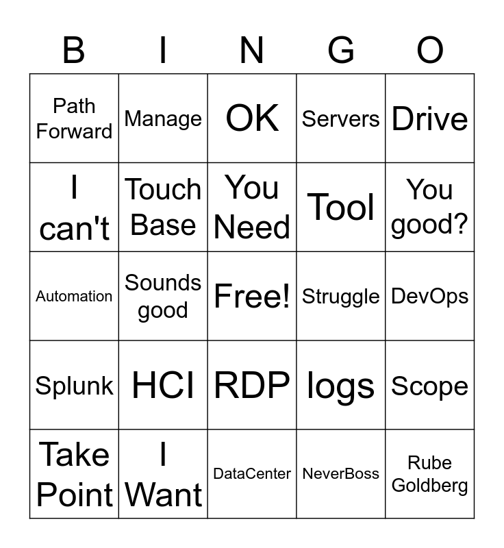 This bingo card has a free space and 24 words: HCI, I Want, You Need, Take Point, Drive, Path Forward, I can't, Manage, Struggle, RDP, Tool, Automation, logs, Scope, Touch Base, NeverBoss, DevOps, OK, You good?, Sounds good, Rube Goldberg, Splunk, Servers and DataCenter.