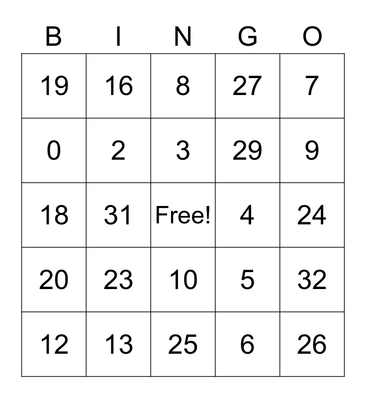 This bingo card has a free space and 34 words: 1, 6, 11, 15, 20, 2, 7, 12, 16, 21, 3, 8, 17, 22, 4, 9, 13, 18, 23, 5, 10, 14, 19, 24, 25, 26, 27, 28, 29, 0, 30, 31, 32 and 33.