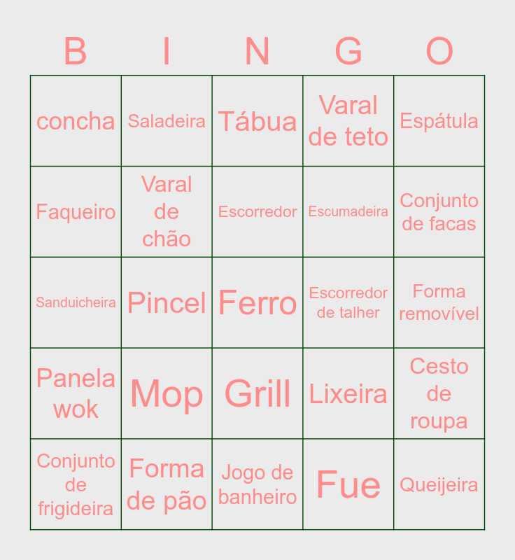 This bingo card has 1 images and 45 words: Ferro, Tábua de passar, Jogo de banheiro, Mop, Assadeiras de vidro, Saladeira, Conjunto de bolo, Faqueiro, Bule, Varal de chão, Varal de teto, Cesto de roupa, Lixeira, Pote de vidro, Pote de plástico, Escorredor, Escorredor de talher, Porta talher, Espátula, Pincel, Fue, concha, Escumadeira, Peneira, Conjunto de facas, Conjunto de frigideira, Frigideira de tapioca, Grill, Panela wok, Pote inox, Bowl, Firma de pizza, Forma de pudim, Forma de bolo, Forma de pão, Forma removível, Conjunto de copo, Jarra de vidro, Conj. de sobremesa, Queijeira, Tábua, Sanduicheira, Espremedor, Batedeira and Panela de pressão.