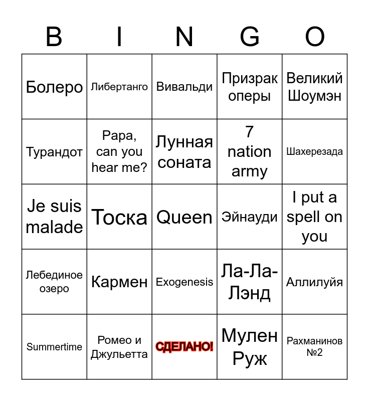 This bingo card has 25 words: Лебединое озеро, Ромео и Джульетта, Queen, Мулен Руж, Великий Шоумэн, Болеро, Либертанго, Вивальди, Эйнауди, Аллилуйя, Турандот, Papa, can you hear me?, СДЕЛАНО!, Ла-Ла-Лэнд, Шахерезада, Summertime, Тоска, Лунная соната, 7 nation army, I put a spell on you, Je suis malade, Кармен, Exogenesis, Призрак оперы and Рахманинов №2.