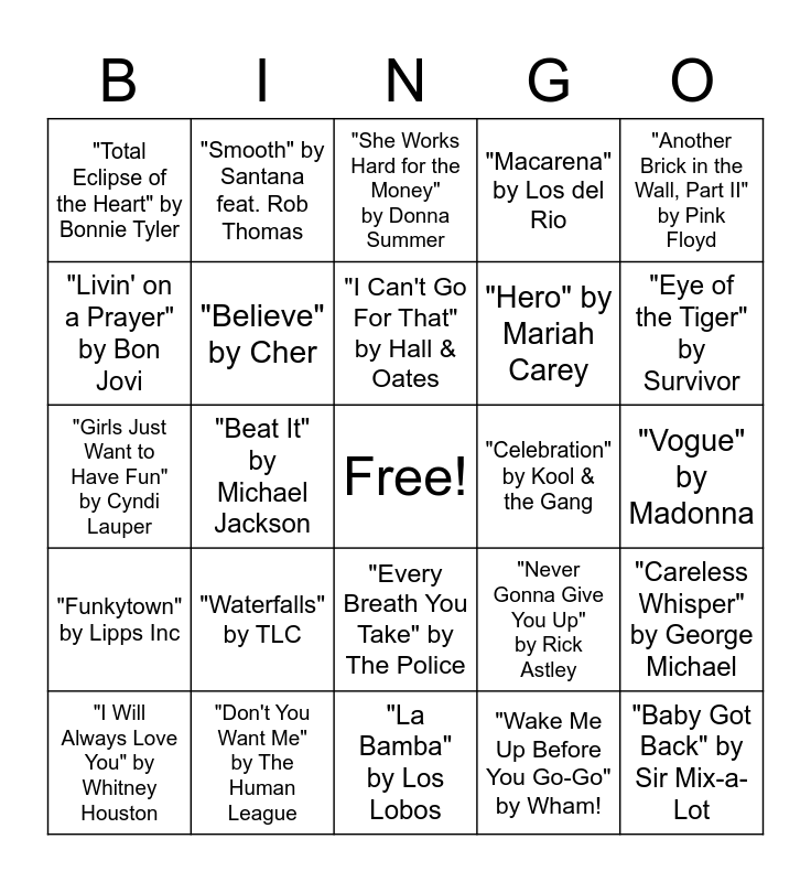 This bingo card has a free space and 24 words: "Waterfalls" by TLC, "Don't You Want Me" by The Human League, "I Can't Go For That" by Hall & Oates, "I Will Always Love You" by Whitney Houston, "Another Brick in the Wall, Part II" by Pink Floyd, "Total Eclipse of the Heart" by Bonnie Tyler, "Livin' on a Prayer" by Bon Jovi, "Smooth" by Santana feat. Rob Thomas, "Celebration" by Kool & the Gang, "Every Breath You Take" by The Police, "Hero" by Mariah Carey, "Girls Just Want to Have Fun" by Cyndi Lauper, "Never Gonna Give You Up" by Rick Astley, "Careless Whisper" by George Michael, "Believe" by Cher, "Wake Me Up Before You Go-Go" by Wham!, "Vogue" by Madonna, "She Works Hard for the Money" by Donna Summer, "Eye of the Tiger" by Survivor, "Beat It" by Michael Jackson, "Baby Got Back" by Sir Mix-a-Lot, "Funkytown" by Lipps Inc, "Macarena" by Los del Rio and "La Bamba" by Los Lobos.