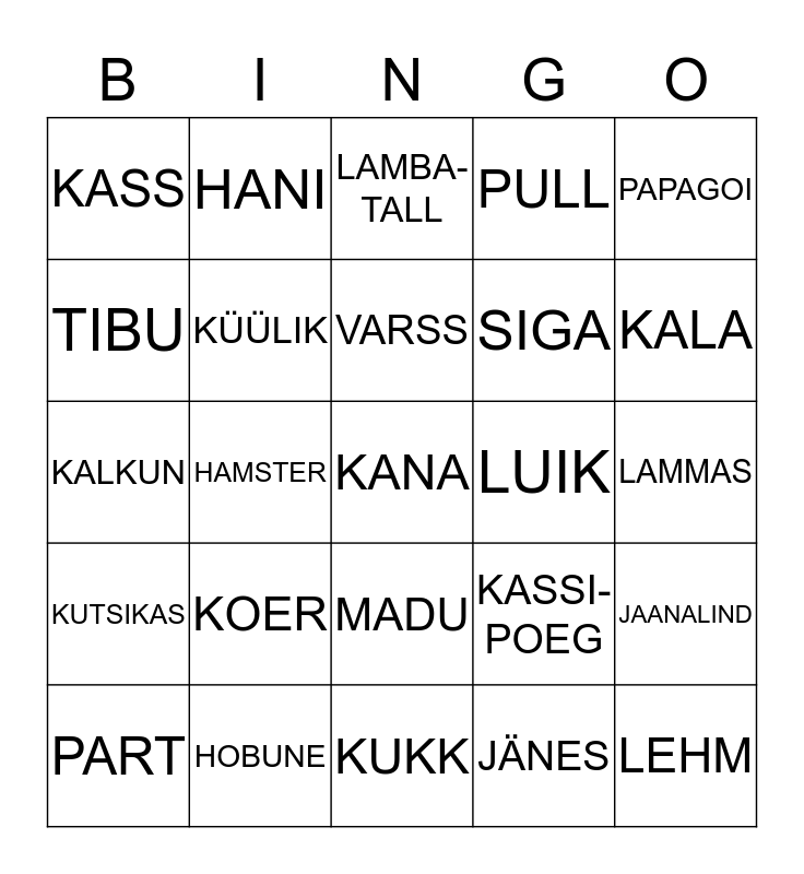 This bingo card has 25 words: KOER, KUKK, VARSS, PART, PAPAGOI, KASS, TIBU, HANI, LUIK, MADU, SIGA, KALKUN, KASSI- POEG, JAANALIND, KÜÜLIK, LEHM, LAMMAS, LAMBA- TALL, KALA, HAMSTER, KANA, HOBUNE, KUTSIKAS, PULL and JÄNES.