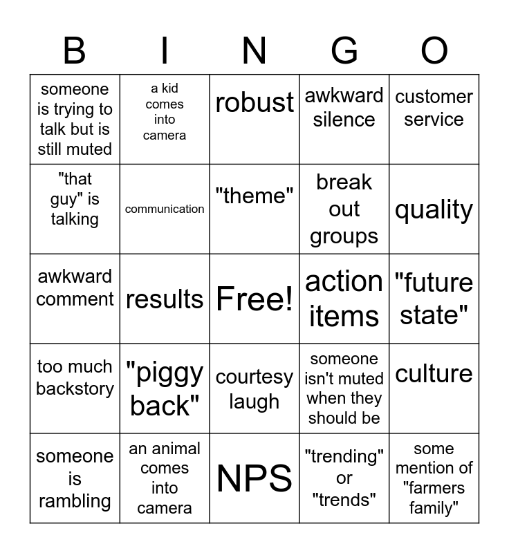This bingo card has a free space and 24 words: "piggy back", an animal comes into camera, "theme", someone is rambling, customer service, someone is trying to talk but is still muted, "that guy" is talking, a kid comes into camera, action items, courtesy laugh, break out groups, awkward comment, someone isn't muted when they should be, culture, communication, "trending" or "trends", "future state", robust, quality, results, some mention of "farmers family", too much backstory, awkward silence and NPS.