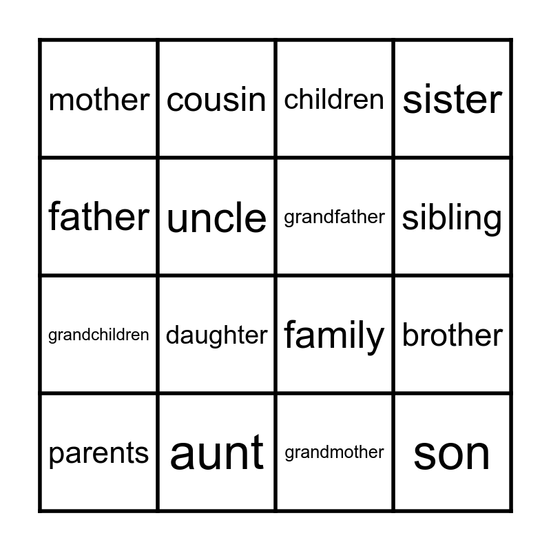 This bingo card has 16 words: aunt, brother, children, mother, grandchildren, cousin, family, grandmother, father, uncle, parents, sister, daughter, sibling, grandfather and son.