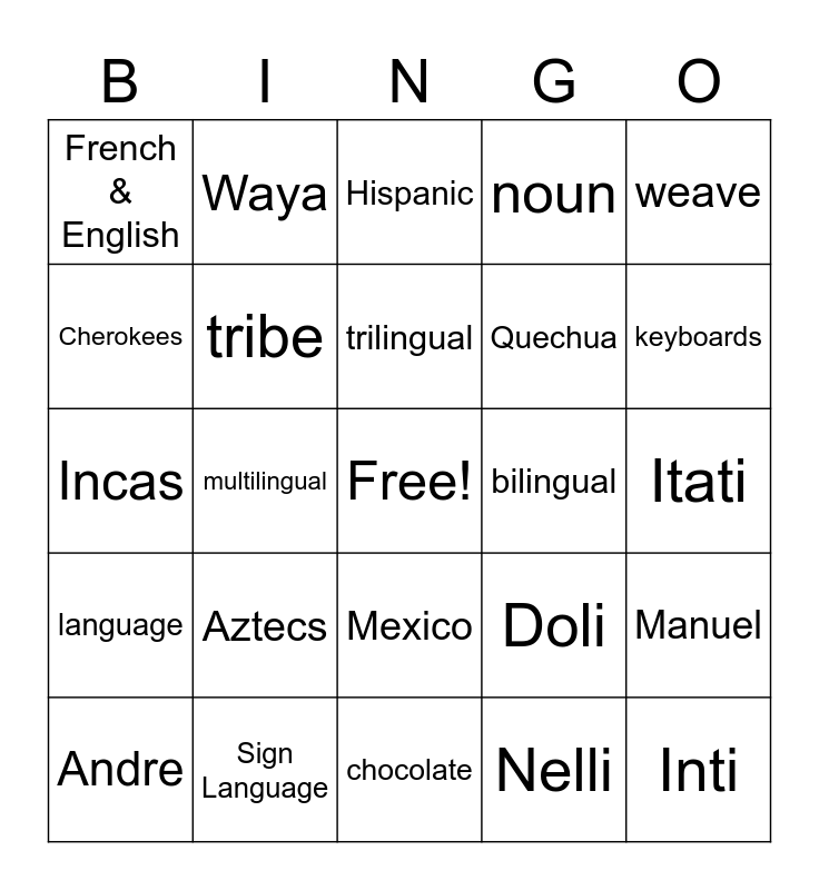 This bingo card has a free space and 24 words: Aztecs, Sign Language, trilingual, Andre, weave, French & English, Cherokees, Waya, bilingual, Mexico, Quechua, Incas, Doli, Manuel, tribe, Nelli, Itati, Hispanic, keyboards, multilingual, Inti, language, noun and chocolate.