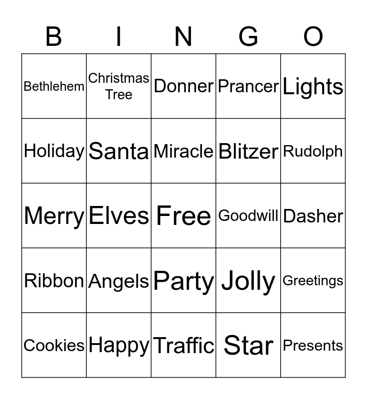 This bingo card has a free space and 24 words: Angels, Happy, Miracle, Cookies, Lights, Bethlehem, Holiday, Christmas Tree, Goodwill, Party, Blitzer, Merry, Jolly, Greetings, Santa, Star, Dasher, Donner, Rudolph, Elves, Presents, Ribbon, Prancer and Traffic.