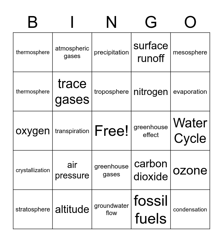This bingo card has a free space and 24 words: air pressure, altitude, troposphere, stratosphere, mesosphere, thermosphere, thermosphere, atmospheric gases, greenhouse effect, greenhouse gases, nitrogen, oxygen, carbon dioxide, ozone, trace gases, fossil fuels, Water Cycle, precipitation, evaporation, transpiration, condensation, crystallization, surface runoff and groundwater flow.