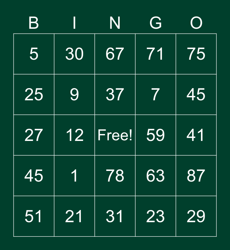 This bingo card has a free space and 24 words: 1, 21, 37, 51, 75, 5, 25, 30, 59, 78, 7, 27, 63, 87, 9, 23, 41, 67, 45, 12, 29, 45, 71 and 31.