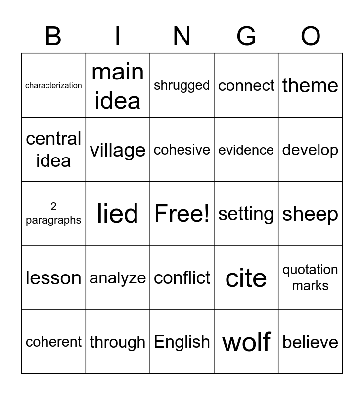 This bingo card has a free space and 24 words: analyze, through, cohesive, coherent, theme, characterization, central idea, main idea, setting, conflict, evidence, 2 paragraphs, cite, quotation marks, village, wolf, sheep, shrugged, develop, lied, believe, lesson, connect and English.