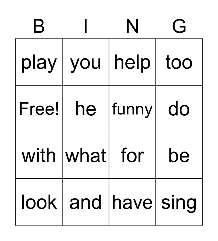 This bingo card has 16 words: and, be, help, play, with, you, for, have, Free!, he, look, too, what, do, funny and sing.