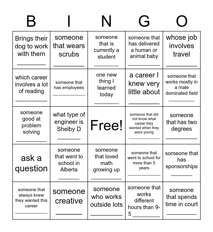 This bingo card has a free space and 31 words: someone who works outside lots _________, someone whose job is stressful ________, what type of engineer is Shelby D _______, someone that can be called in for emergencies _____________, Brings their dog to work with them ________, someone that is currently a student ________, someone that has employees _____________, someone that went to school for more than 5 years ______________, someone that did not know what career they wanted when they were young _______________, someone that works different hours than 9-5 _________, someone that has two degrees __________, someone that spends time in court _________, someone that has broken world records ______, someone that works with animals _______, someone that works mostly in a male dominated field __________, someone that went to the Tokyo Paralympics ____________, someone that has sponsorships _______, someone that went to school in Alberta _______, ask a question, someone that loved math growing up __________, whose job involves travel ________, someone that has a business outside of their career ____________, someone that always knew they wanted this career _____________, someone that wears scrubs ________, a career I knew very little about ________, which career involves a lot of reading __________, someone that has delivered a human or animal baby ___________, someone good at problem solving __________, someone creative ______, one new thing I learned today ________ and a career that sounds fun _________.