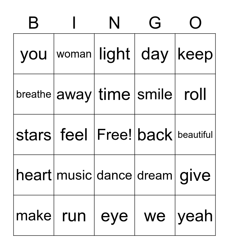 This bingo card has a free space and 49 words: baby, yeah, love, eye, music, lonely, woman, boy, breathe, fire, away, day, give, dream, world, little, time, back, never, keep, feel, we, you, smile, like, roll, make, hate, dance, heart, home, slow, fast, meet, run, one, down, small, beautiful, late, forever, crazy, somebody, dress, stars, light, up, sad and grow.