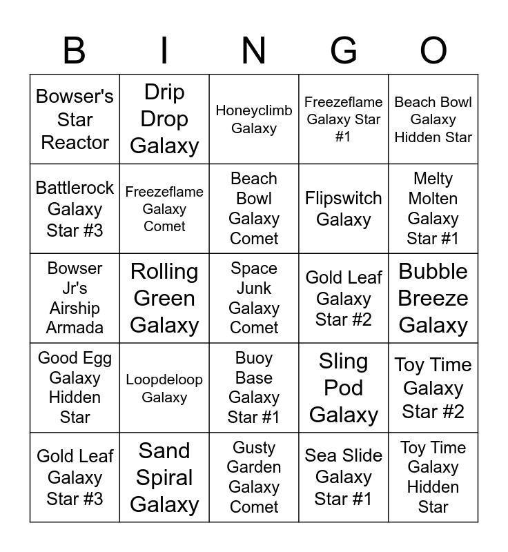 This bingo card has 25 words: Loopdeloop Galaxy, Gusty Garden Galaxy Comet, Beach Bowl Galaxy Comet, Gold Leaf Galaxy Star #3, Beach Bowl Galaxy Hidden Star, Bowser's Star Reactor, Battlerock Galaxy Star #3, Drip Drop Galaxy, Gold Leaf Galaxy Star #2, Buoy Base Galaxy Star #1, Flipswitch Galaxy, Bowser Jr's Airship Armada, Sling Pod Galaxy, Toy Time Galaxy Star #2, Freezeflame Galaxy Comet, Toy Time Galaxy Hidden Star, Bubble Breeze Galaxy, Honeyclimb Galaxy, Melty Molten Galaxy Star #1, Rolling Green Galaxy, Space Junk Galaxy Comet, Sand Spiral Galaxy, Good Egg Galaxy Hidden Star, Freezeflame Galaxy Star #1 and Sea Slide Galaxy Star #1.