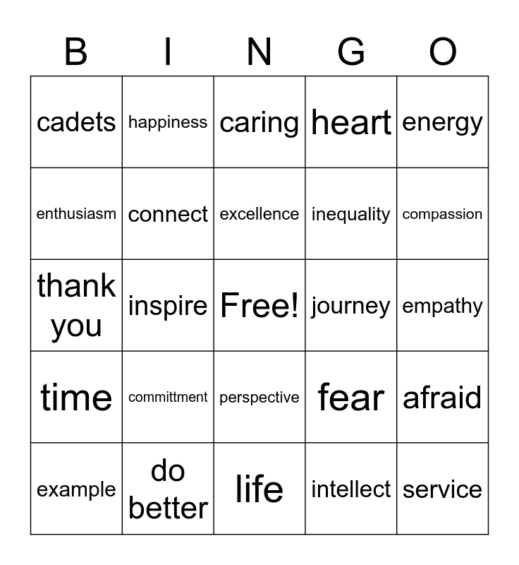 This bingo card has a free space and 24 words: committment, do better, excellence, example, energy, cadets, enthusiasm, happiness, journey, perspective, inequality, thank you, fear, afraid, connect, intellect, empathy, caring, compassion, inspire, service, time, heart and life.