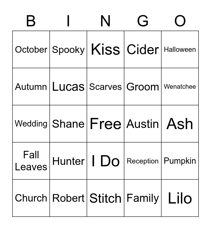 This bingo card has a free space and 29 words: Church, Amanda, Shane, True Luff, October, Kiss, Lucas, Hunter, Austin, Robert, Ash, Lilo, Stitch, Family, Wenatchee, Apples, I Do, Fall Leaves, Halloween, Wedding, Reception, Bride, Groom, Autumn, Cider, Spooky, Pumpkin, Scarves and Valley.