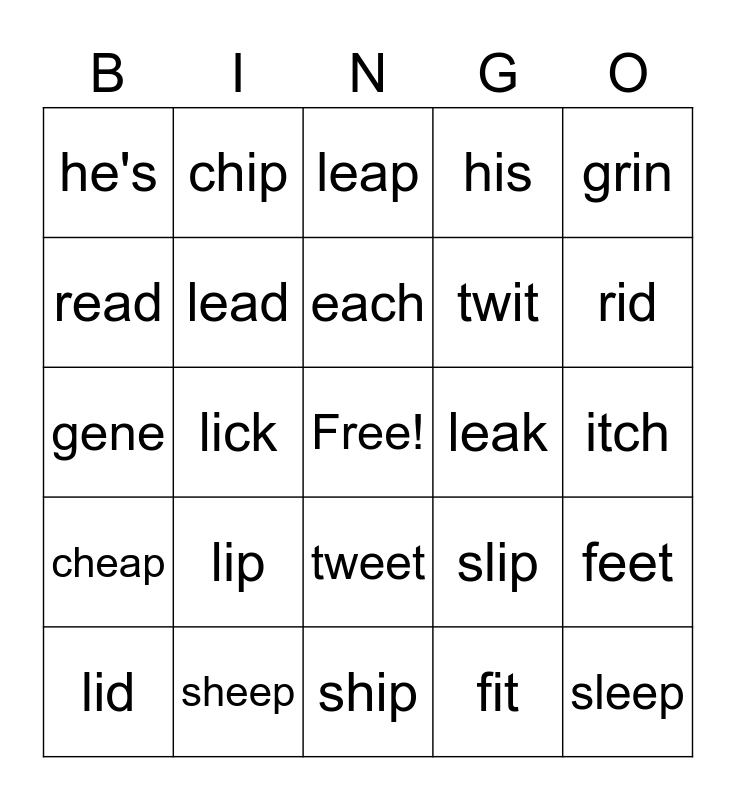 This bingo card has a free space and 24 words: lip, sheep, each, lid, grin, he's, read, chip, leak, tweet, twit, gene, slip, feet, lead, fit, itch, leap, rid, lick, sleep, cheap, his and ship.