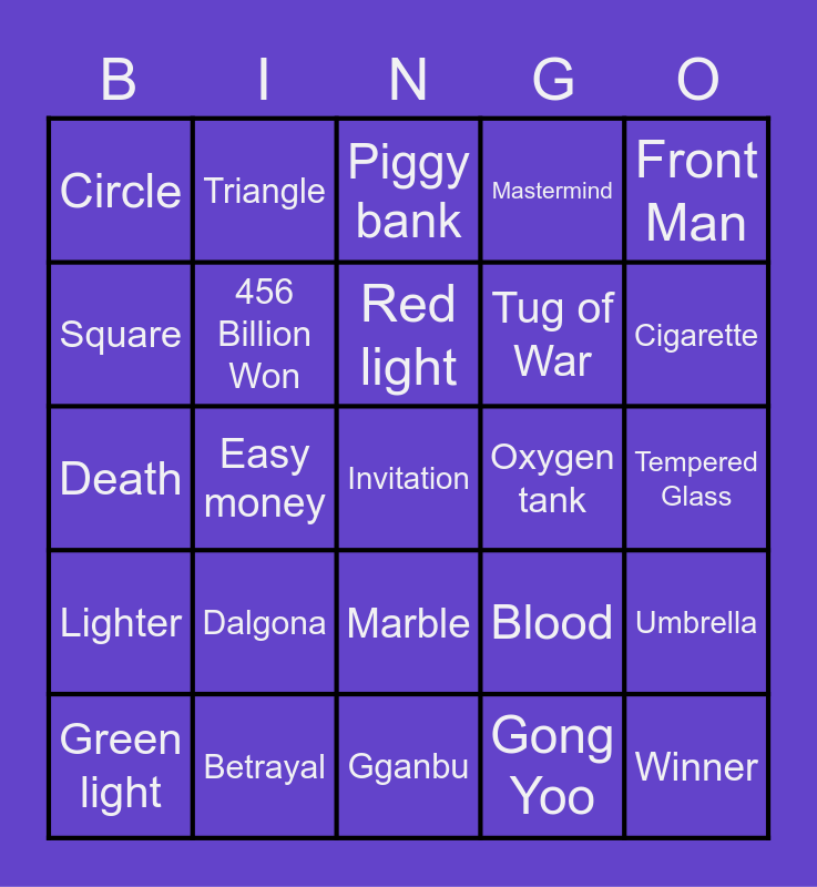 This bingo card has 25 words: Dalgona, Gganbu, Red light, Green light, Front Man, Circle, Square, Triangle, Oxygen tank, Marble, Tug of War, Death, Blood, Umbrella, 456 Billion Won, Winner, Tempered Glass, Piggy bank, Cigarette, Easy money, Invitation, Betrayal, Lighter, Mastermind and Gong Yoo.