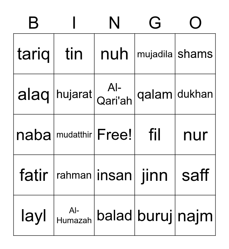 This bingo card has a free space and 24 words: rahman, Al-Humazah, Al-Qari'ah, layl, shams, tariq, alaq, tin, fil, insan, qalam, naba, jinn, saff, hujarat, buruj, nur, nuh, dukhan, mudatthir, najm, fatir, mujadila and balad.