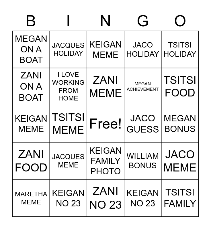 This bingo card has a free space and 35 words: BURNING THE MIDNIGHT OIL, BUSINESS AT THE TOP, “IS THAT AN OLD HAND?”, I LOVE WORKING FROM HOME, KEIGAN FAMILY PHOTO, JACO HOLIDAY, ZANI ON A BOAT, JACO FOOD, ZANI MEME, MARETHA ACHIEVEMENT, KEIGAN MEME, TSITSI HOLIDAY, JACO MEME, KEIGAN PET, MEGAN ON A BOAT, JACO GUESS, KEIGAN NO 23, TSITSI MEME, ZANI FOOD, TSITSI FAMILY, WILLIAM BONUS, MARETHA MEME, JACO MEME, KEIGAN NO 23, KEIGAN MEME, TSITSI FOOD, WILLIAM HOLIDAY, MARETHA PET, MEGAN ACHIEVEMENT, MEGAN BONUS, WILLIAM MEME, ZANI NO 23, JACQUES MEME, JACQUES HOLIDAY and JACQUES GUESS.