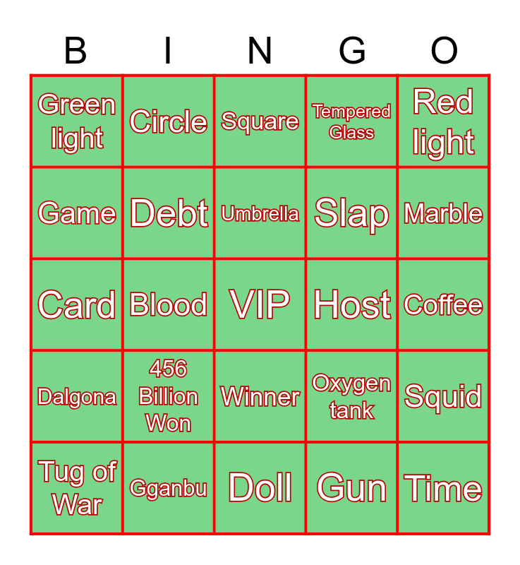 This bingo card has 25 words: Dalgona, Gganbu, VIP, Gun, Red light, Green light, Circle, Square, Host, Squid, Game, Debt, Doll, Oxygen tank, Marble, Tug of War, Blood, Umbrella, Slap, Coffee, Card, 456 Billion Won, Winner, Tempered Glass and Time.