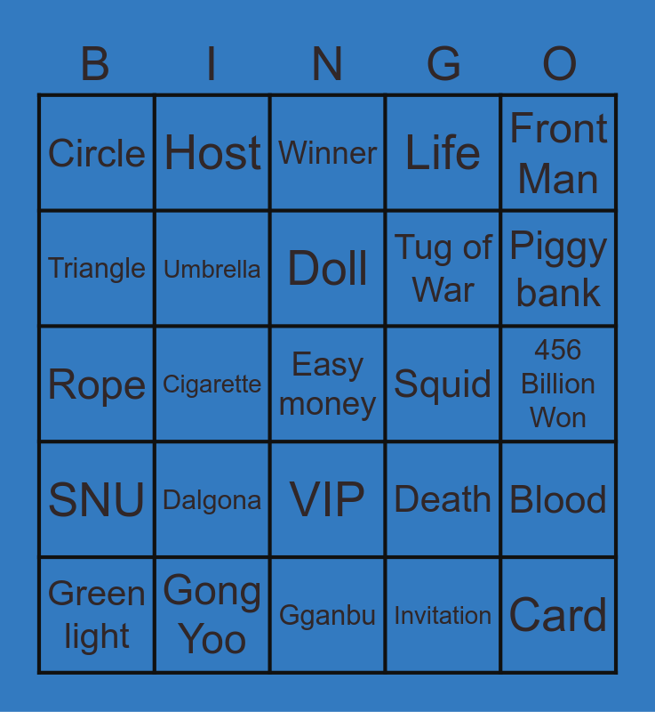 This bingo card has 25 words: Dalgona, Gganbu, Doll, Green light, Front Man, Circle, Triangle, Host, Squid, VIP, Tug of War, Rope, Death, Blood, Umbrella, Card, 456 Billion Won, Winner, Piggy bank, Cigarette, Easy money, Gong Yoo, SNU, Life and Invitation.