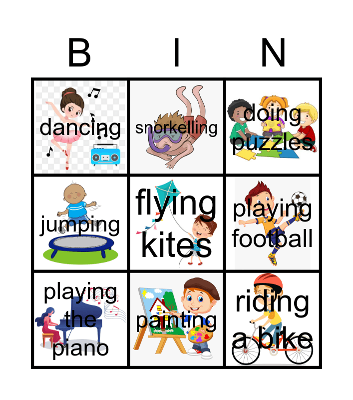This bingo card has 12 images and 12 words: climbing trees, riding a bike, flying kites, playing football, snorkelling, doing puzzles, painting, singing, dancing, jumping, playing the piano and swimming.