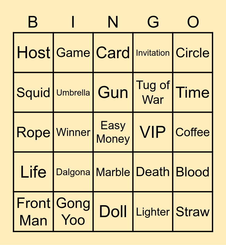 This bingo card has 25 words: Dalgona, Doll, Gun, Front Man, Circle, Host, Squid, Game, VIP, Marble, Tug of War, Rope, Death, Blood, Umbrella, Straw, Coffee, Card, Time, Winner, Easy Money, Gong Yoo, Life, Invitation and Lighter.