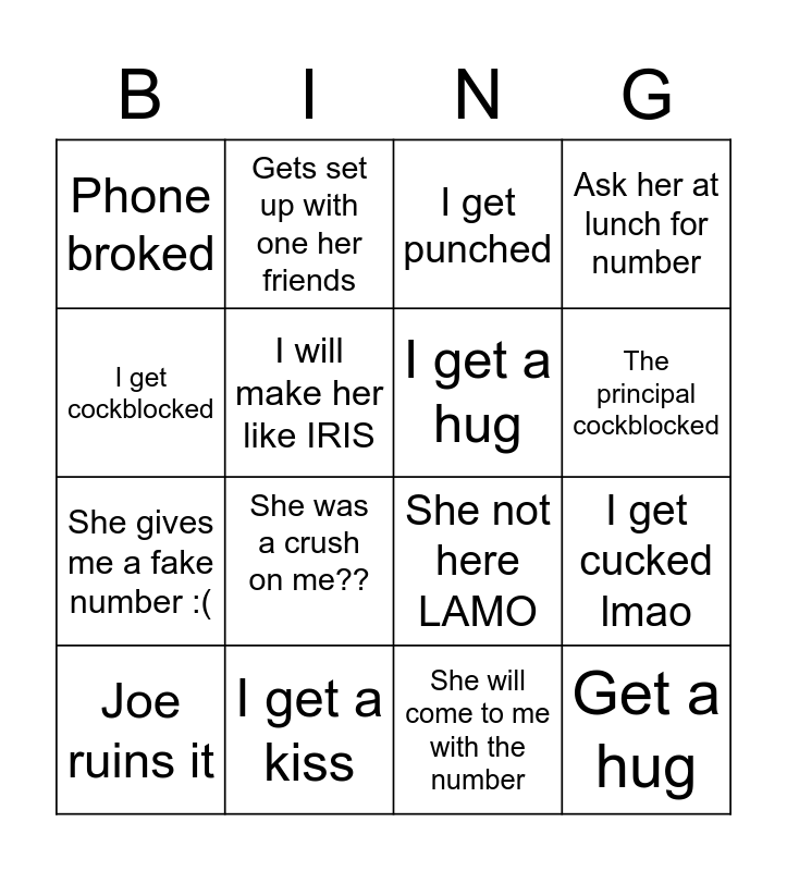 This bingo card has 17 words: She will come to me with the number, Joe ruins it, I get punched, Phone broked, She was a crush on me??, Ask her at lunch for number, I get cucked lmao, I get a hug, The principal cockblocked, I will make her like IRIS, I get a kiss, She not here LAMO, I get cockblocked, Gets set up with one her friends, She gives me a fake number :(, She ask me out and Get a hug.