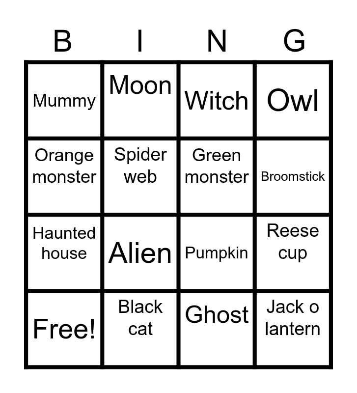 This bingo card has 23 words: Frankenstein, Bat, Pumpkin, Jack o lantern, Haunted house, Moon, Witch, Owl, Free!, Black cat, Ghost, Broomstick, Witch hat, Vampire, Candy corn, Clouds, Mummy, Spider web, Green monster, Reese cup, Orange monster, Alien and Trick or treat.