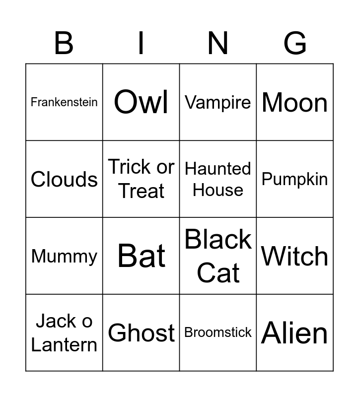 This bingo card has 16 words: Ghost, Witch, Vampire, Frankenstein, Mummy, Owl, Black Cat, Broomstick, Clouds, Trick or Treat, Jack o Lantern, Moon, Bat, Pumpkin, Haunted House and Alien.