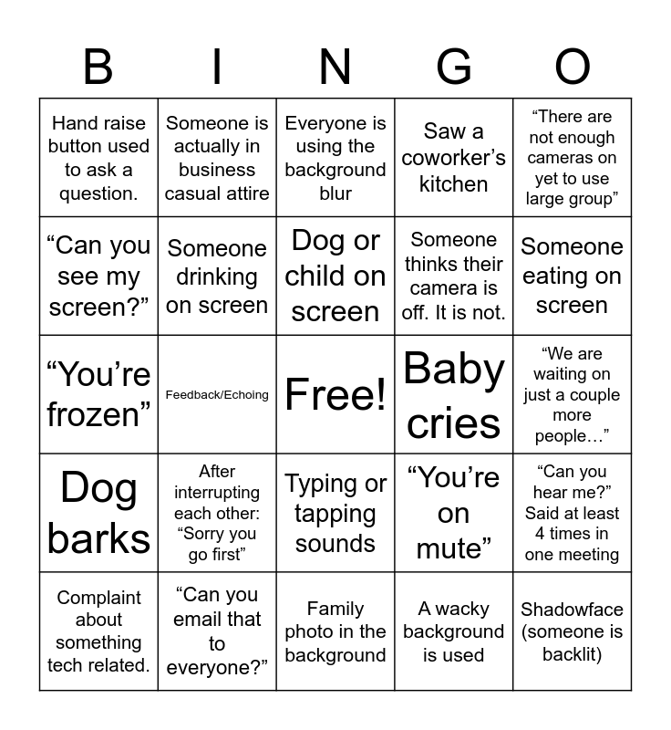 This bingo card has a free space and 27 words: “You’re on mute”, Embarrassing content on screen, Someone thinks their camera is off. It is not., Family photo in the background, “Can you see my screen?”, Everyone is using the background blur, Someone is actually in business casual attire, Dog barks, Baby cries, “Can you hear me?” Said at least 4 times in one meeting, “You’re frozen”, Saw a coworker’s kitchen, Complaint about something tech related., “Can you email that to everyone?”, Someone eating on screen, Someone in their bedroom, Someone drinking on screen, Dog or child on screen, After interrupting each other: “Sorry you go first”, Hand raise button used to ask a question., “We are waiting on just a couple more people…”, A wacky background is used, Feedback/Echoing, Shadowface (someone is backlit), Typing or tapping sounds, “There are not enough cameras on yet to use large group” and “I love seeing all of these faces”.