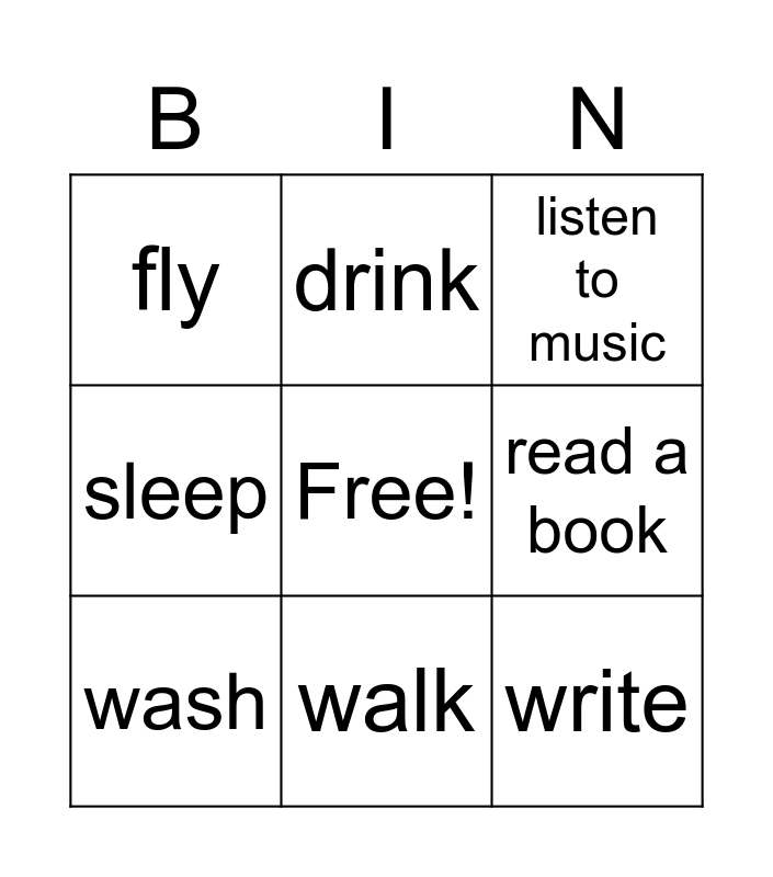 This bingo card has a free space and 14 words: eat, cook, wash, drink, sleep, write, speak, swim, walk, fly, watch TV, read a book, listen to music and take a shower.
