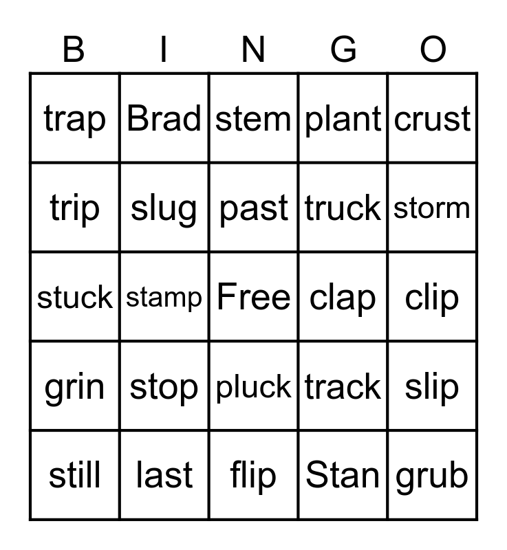 This bingo card has a free space and 24 words: stop, last, past, still, crust, trap, trip, Brad, clap, pluck, truck, stuck, track, slip, slug, Stan, clip, stem, storm, stamp, grub, grin, plant and flip.