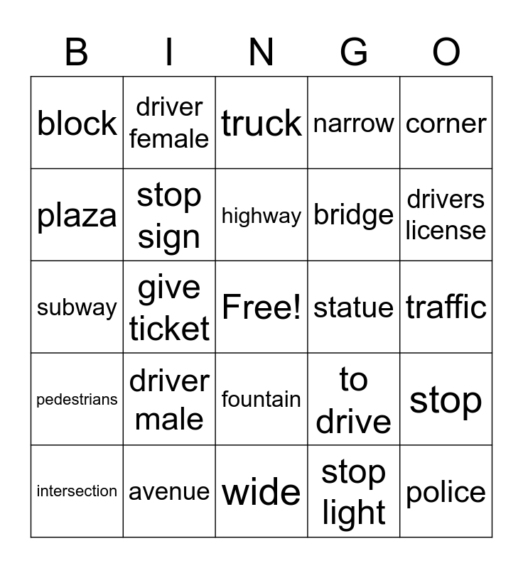 This bingo card has a free space and 24 words: driver male, avenue, highway, intersection, corner, block, plaza, driver female, statue, fountain, bridge, subway, to drive, stop, stop sign, stop light, traffic, truck, drivers license, give ticket, police, pedestrians, narrow and wide.