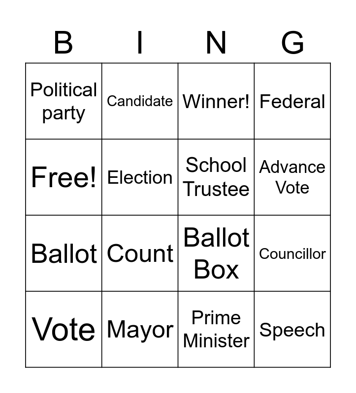 This bingo card has 16 words: Mayor, Councillor, Winner!, Political party, Ballot, Candidate, Ballot Box, Prime Minister, Free!, Election, Vote, Federal, Count, Advance Vote, School Trustee and Speech.