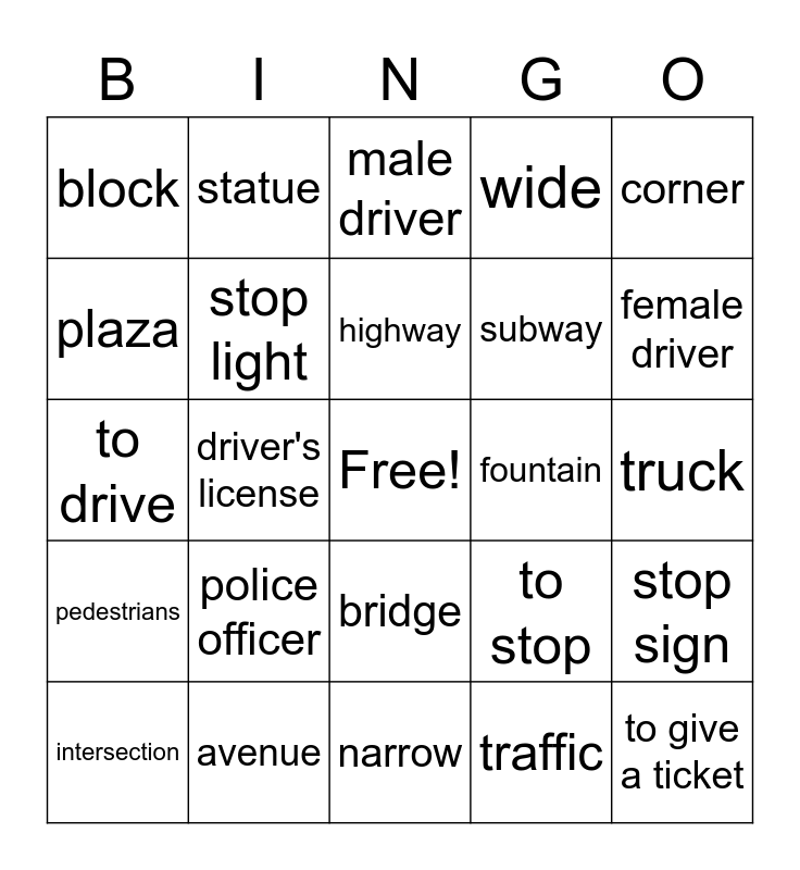 This bingo card has a free space and 24 words: police officer, avenue, highway, intersection, corner, block, plaza, statue, fountain, bridge, subway, to drive, to stop, stop sign, stop light, traffic, truck, male driver, female driver, driver's license, to give a ticket, pedestrians, wide and narrow.
