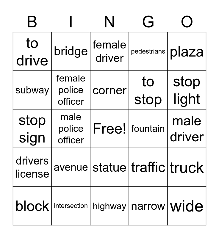 This bingo card has a free space and 24 words: avenue, intersection, corner, block, plaza, to drive, subway, bridge, fountain, statue, to stop, stop sign, traffic, truck, female police officer, narrow, male driver, female driver, stop light, male police officer, wide, drivers license, pedestrians and highway.