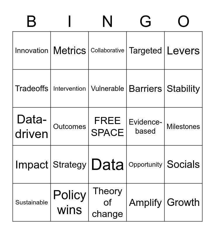 This bingo card has a free space and 39 words: Scale, Pilot, Pathways, Intervention, Sustainable, Data, Vulnerable, Surplus, Levers, Impact, Outcomes, Targeted, Growth, Milestones, Evidence-based, Strategy, Mobility, Innovation, ROI, Opportunity, Tradeoffs, Theory of change, Barriers, Stability, a there there, MA support, Political environment, Measurable, Mayoral transition, Metrics, Accountability, B/C, Collaborative, Policy wins, Amplify, Capital, Socials, Data-driven and Conservative estimate.