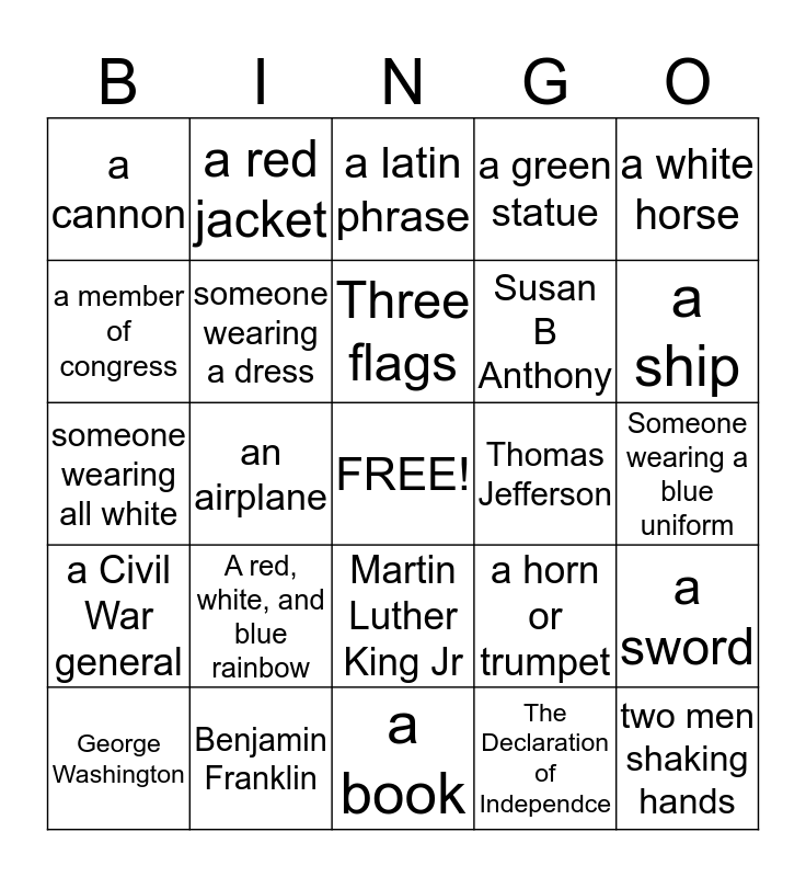 This bingo card has a free space and 24 words: A red, white, and blue rainbow, Benjamin Franklin, Three flags, George Washington, a white horse, a cannon, a member of congress, a red jacket, Thomas Jefferson, Martin Luther King Jr, Susan B Anthony, someone wearing all white, a horn or trumpet, a sword, someone wearing a dress, The Declaration of Independce, Someone wearing a blue uniform, a latin phrase, a ship, an airplane, two men shaking hands, a Civil War general, a green statue and a book.