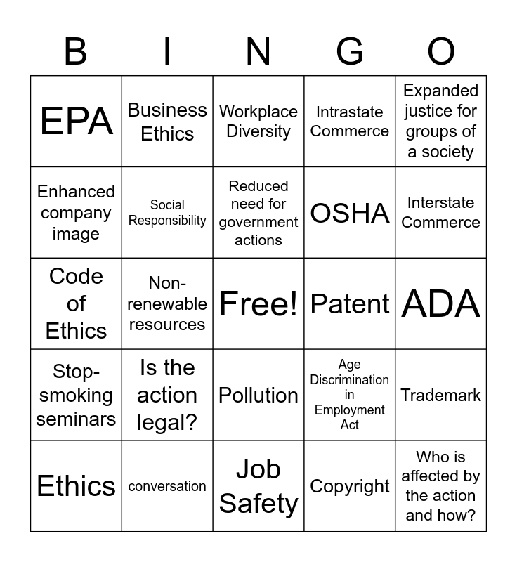 This bingo card has a free space and 24 words: Is the action legal?, conversation, Reduced need for government actions, Ethics, Expanded justice for groups of a society, EPA, Enhanced company image, Business Ethics, Patent, Pollution, OSHA, Code of Ethics, Age Discrimination in Employment Act, Trademark, Social Responsibility, Copyright, ADA, Workplace Diversity, Interstate Commerce, Non-renewable resources, Who is affected by the action and how?, Stop-smoking seminars, Intrastate Commerce and Job Safety.