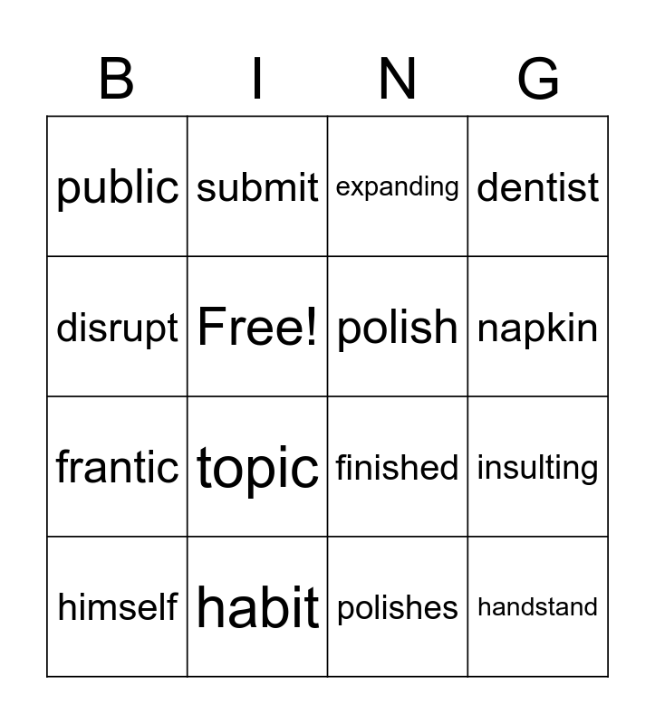 This bingo card has 47 words: punish, himself, catfish, whiplash, velvet, magnet, submit, profit, Free!, contest, polish, dentist, splendid, index, goblin, combat, napkin, habit, invented, disrupt, insulting, insisted, public, frantic, picnic, topic, pumpkin, windmill, chestnut, handstand, blindfold, contract, obstructed, conduct, children, polished, polishes, publishes, punishing, disrupts, extended, expanding, finished, implanted, disrupted, insisting and complex.