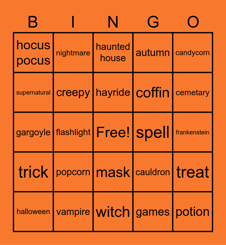 This bingo card has a free space and 75 words: dracula, devil, haunted house, headless horseman, thriller, scream, beetlejuice, cobweb, skull, magic, scarecrow, horror, hayride, supernatural, fangs, flashlight, paranormal, potion, wand, candycorn, nightmare on elm street, gargoyle, creepy, nightmare, autumn, bat, black, blood, bones, boo, broom, candy, casper, cauldron, cemetary, coffin, costume, eerie, frankenstein, games, ghost, ghostbusters, ghoul, goblin, gremlins, grim reaper, halloween, hocus pocus, howl, jack-o-lantern, leaves, mask, monster, monster mash, moon, mummy, night, october, orange, party, popcorn, pumpkin, scary, shadow, skeleton, spell, spider, spooky, tomb, treat, trick, vampire, werewolf, witch and zombie.