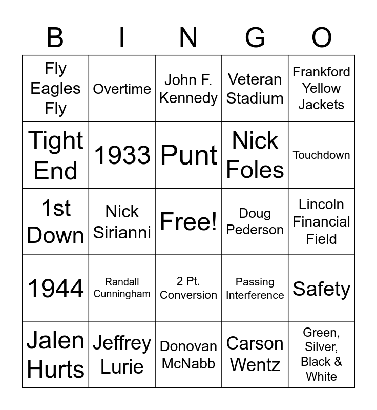 This bingo card has a free space and 29 words: Jalen Hurts, Super Bowl LII (52), Nick Sirianni, Steagles, Fly Eagles Fly, John F. Kennedy, 1933, Randall Cunningham, Doug Pederson, Jeffrey Lurie, Lincoln Financial Field, Green, Silver, Black & White, Donovan McNabb, Carson Wentz, Touchdown, Field Goal, 2 Pt. Conversion, 1944, Frankford Yellow Jackets, 1st Down, Passing Interference, Flag on the Play, Nick Foles, Tight End, Veteran Stadium, Overtime, Safety, Punt and Kick-Off.